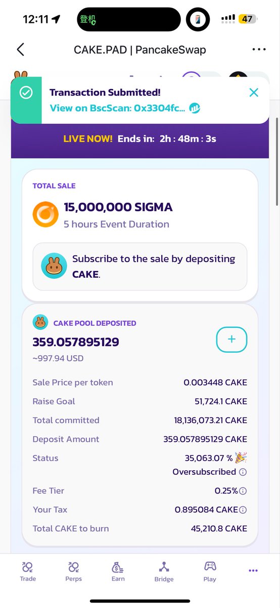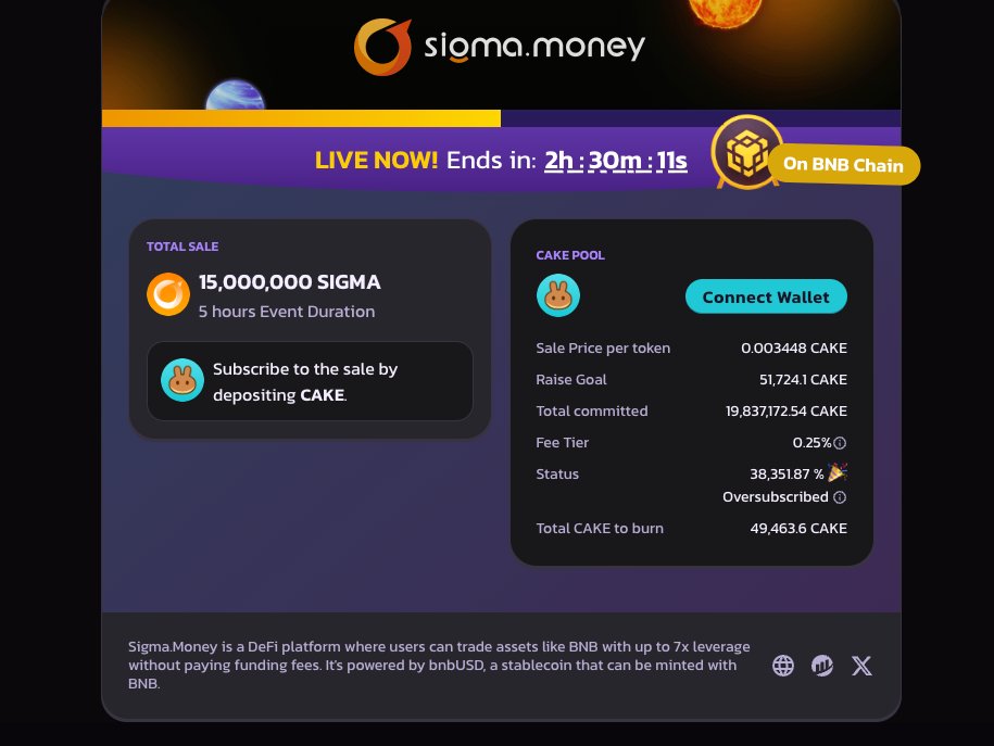 (@sigmadotmoney)CAKE.PAD 已正式结束🍰🎉 领取您的 $SIGMA 代币和 $CAKE 退款 → $SIGMA 已在 PancakeSwap 上上线,立即开始交换和交易 → 🪙 承诺总数:51,314,420