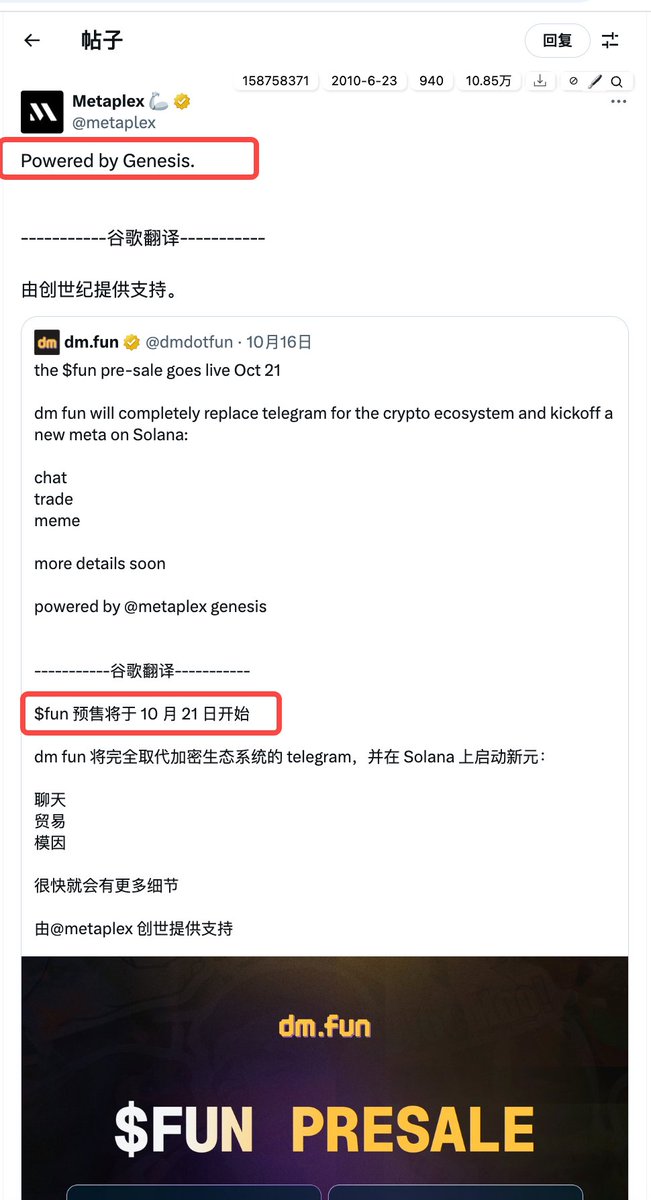 之前提到过的 @metaplex Genesis协议新项目 @dmdotfun ,21 号开始
