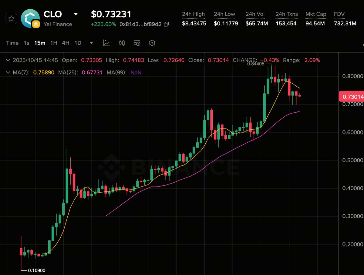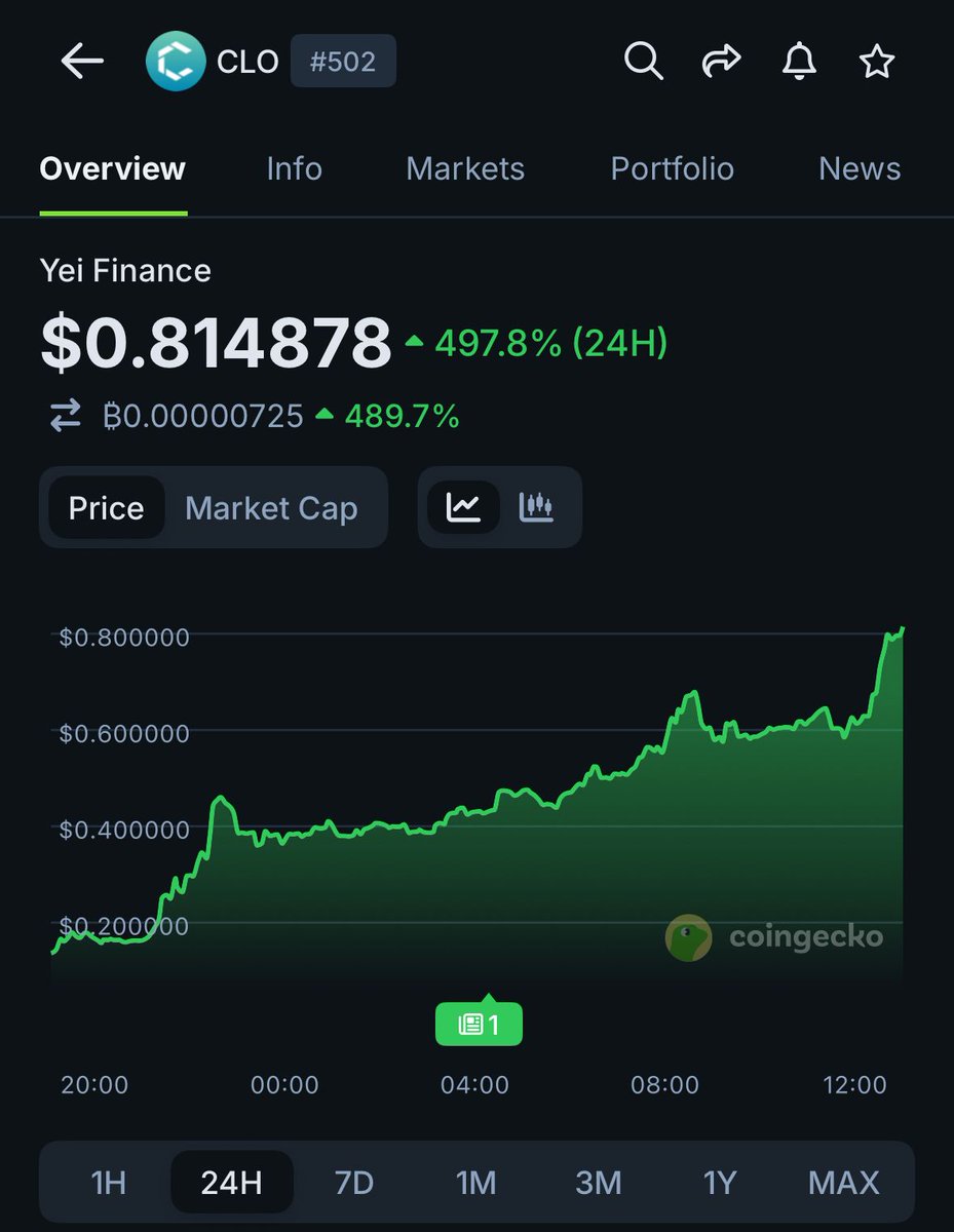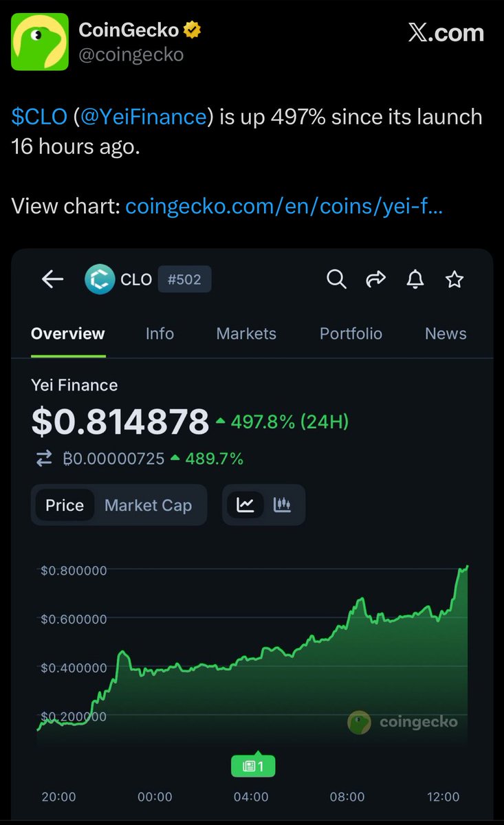 自 16 小时前推出以来,$CLO (@YeiFinance) 已上涨 497%。 查看图表: