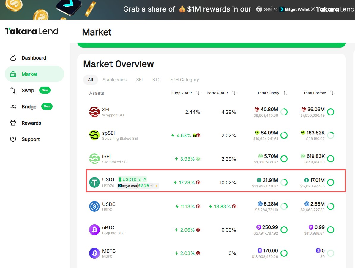 前天 @YeiFinance $CLO 上线,有宝子开始关注Sei链 @SeiNetwork ,问我Sei生态还有什么值得去深度参与的项目。🤔 目前Sei 生态的项目大部分还在 pre-TGE 阶段,但却是不错的早期布局时期。 这边再分享两个我在关注的项目 @TakaraLend@SymphonyAg。 🌟@TakaraLend 是 Sei 生态中的借贷协议,提供 USDT、USDC 等稳定币的高收益存款(APR≈14%‑18%)和0借款手续费。 目前参与的角度是质押赚取APR➕平台代币 $Karats 激励。 在与Bitget Wallet 合作提供的流动性挖矿活动中USDT apr高达17.33% 👇 ▪️数据上,最近表现亮眼,TMV在两个月内从1亿美元翻倍到2亿美元,增长200%。 ▪️团队背景中,核心成员之前做过$250M+ TVL的成熟项目。 ▪️机制设计上,支持多种资产抵押,收益分配透明,而且借助Sei的原生订单簿引擎,体验接近CEX。 〰️〰️〰️〰️ 🌟@SymphonyAg 定位是Sei生态的原生聚合器,最近获得了Sei基金会的重点支持,要把它打造成Sei网络的核心产品之一。 ▪️背后是 SEIYAN 团队在孵化,这个团队之前就在Sei生态深耕,组织过Memecoin Madness活动。 ▪️目前参与角度是 SWAP 交互赚取积分➕交互赚取代币 $SEIYAN 的活动。 这两个项目,一个是已经跑起来的借贷协议,一个是有Foundation背书的生态入口。 都还在早期,可以深入研究一下。🤔