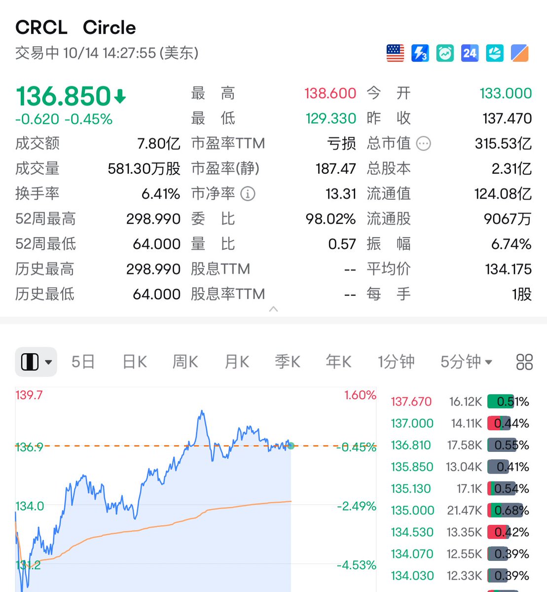 举个例子,Circle 股票 $CRCL 于 2025 年 6 月 5 日 IPO ,当日大涨168%,收盘价为 $83 ,后续持续冲高,6 月 23 日达到峰值 $298.99 ,目前稳定在 $160 左右。即使以目前价格计算,较 IPO 价格仍有422%涨幅。