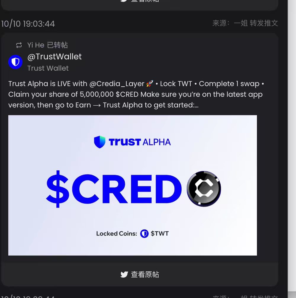 $CRED 正式上线 Trust Alpha,用你的 $TWT 就能直接挖 CRED。这不是普通的 Launchpool,而是 Trust Wallet 官方的新项目启动平台,首发项目就是 Credia Layer @Credia_Layer 的原生代币 $CRED。