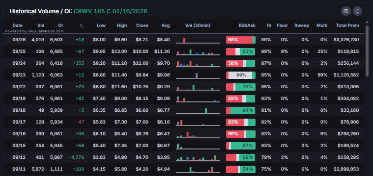 $CRWV 今天收盘上涨 7.47%,我周三强调的看涨合约绝对爆炸式增长。