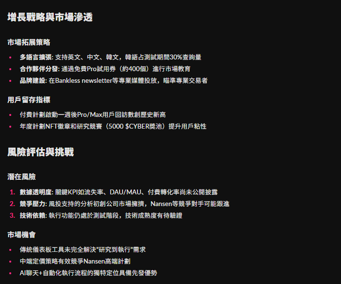 用戶留存是衡量產品市場契合度的關鍵。數據顯示,在付費計劃正式啟動一周後,Pro和Max等級用戶的回訪數量即創下歷史新高,表明核心用戶對所提供的增值功能認可度較高。此外,項目還通過發行年度計劃NFT徽章和舉辦研究競賽(提供5000 $CYBER 獎池)等Web3原生方式提升社區參與感和用戶粘性,這些舉措有助於構建長期穩定的用戶關系。