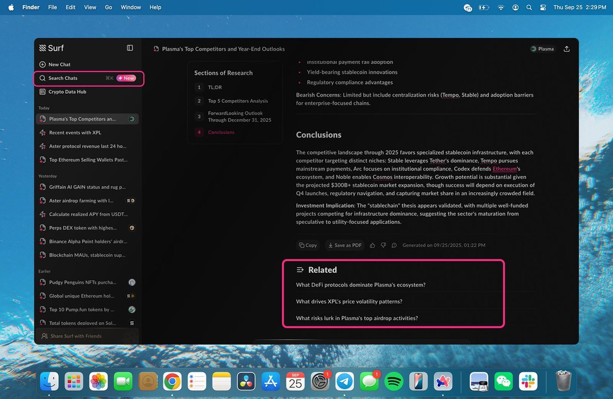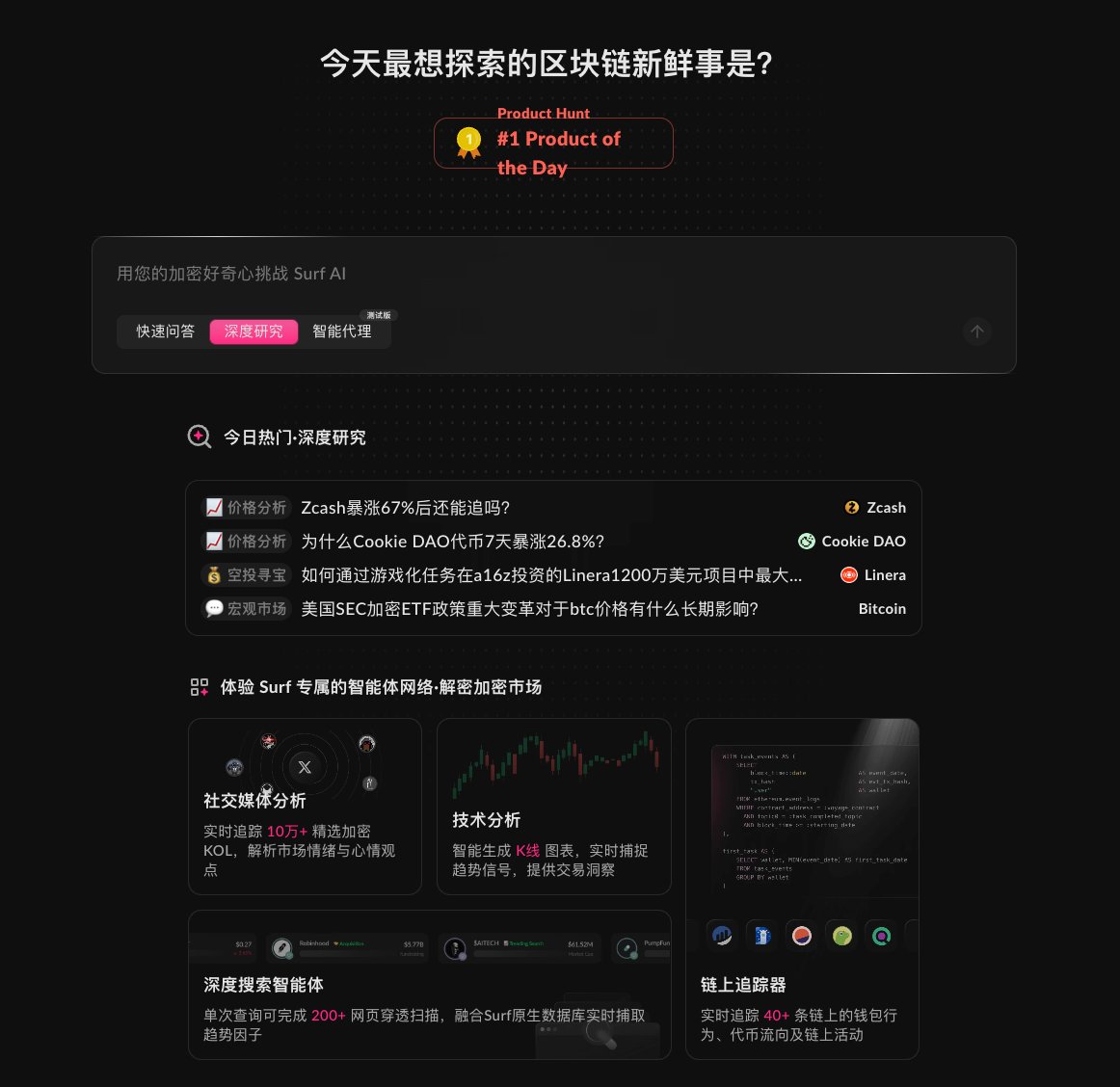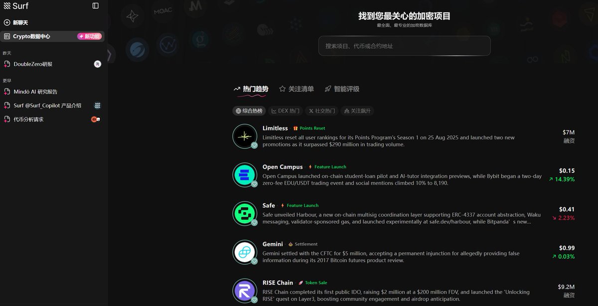 加密信息過載是個真實痛點,每天要看的資料太多了。傳統工具要麼太泛化(GPT類),要麼太單一(只做價格或只做鏈上數據)Surf算是找到了一個不錯的產品定位。