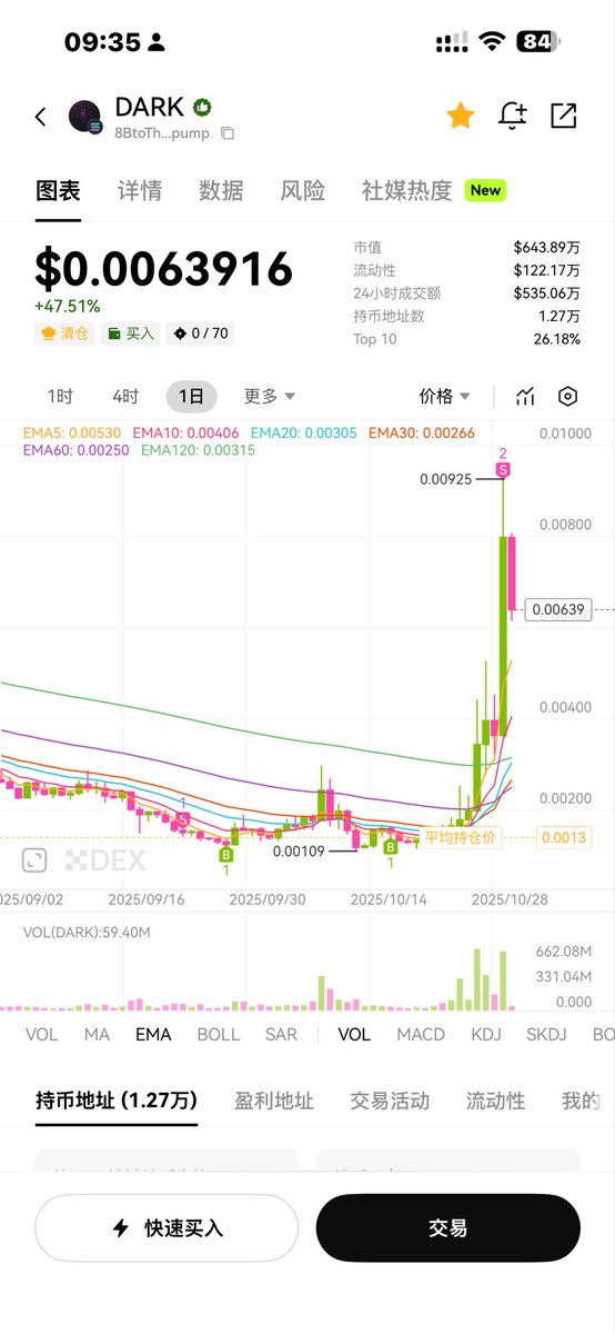 $dark 币安alpha就有 1千万市值这里筑底支撑很强,目前小级别出现拐点,可以介入博拉升,目前1400w市值。 Ca: 8BtoThi2ZoXnF7QQK1Wjmh2JuBw9FjVvhnGMVZ2vpump