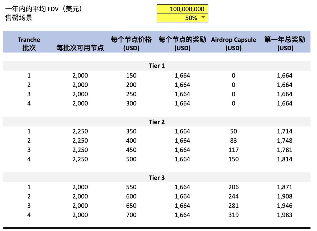 节点持有者在项目主网上线时可解锁10%的奖励,后面每天挖矿解锁。按照1亿FDV计算,一个T1节点(基础款)一年可以获得1600+USD收入,也就是TGE一兩個內月即可回本(如下图)。