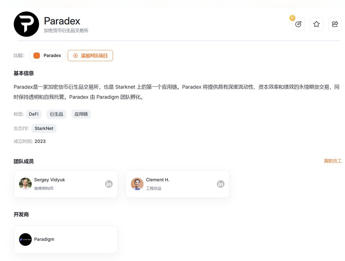 Paradex @paradex 是第一个基于Starknet堆栈开发的应用链,也是StarkWare官方支持的项目,利用ZK-Rollup技术,实现了高速交易和低廉手续费。Paradex 将提供具有深度流动性、资本效率和绩效的永续期货交易,同时保持透明和自我托管。Paradex 由 Paradigm @tradeparadigm 团队孵化,Paradigm 是跨 CeFi 和 DeFi 的加密衍生品交易者的流动性网络,融资了3500万美金,有GSR、蜻蜓资本、DCG等明星机构参投
