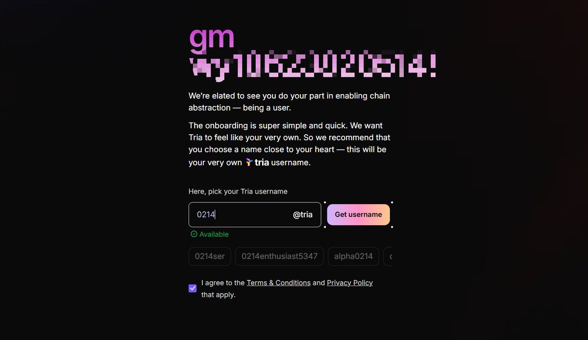 10月14日完成种子轮融资1200万美金的模块化链抽象基础设施Tria @useTria 明牌空投,预计今年就会TGE,交互就是刷交易,重要的是先去抢一个不错的昵称!