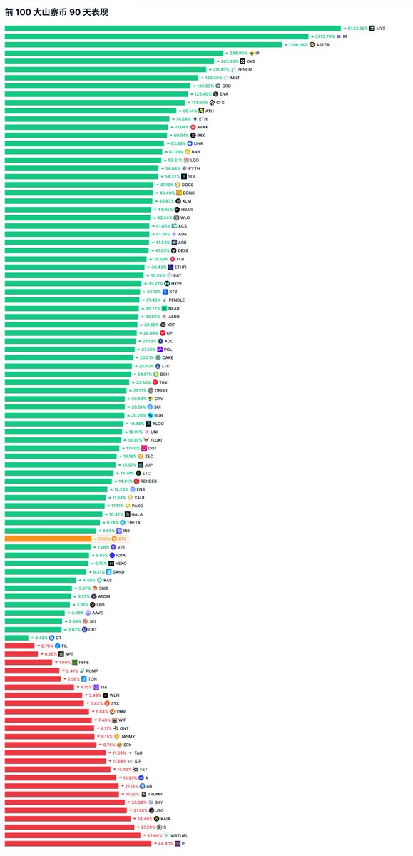 刷到了@Meta8Mate老师的推文「山寨季红黑榜|前 100 大山寨币 90 天涨跌表现」