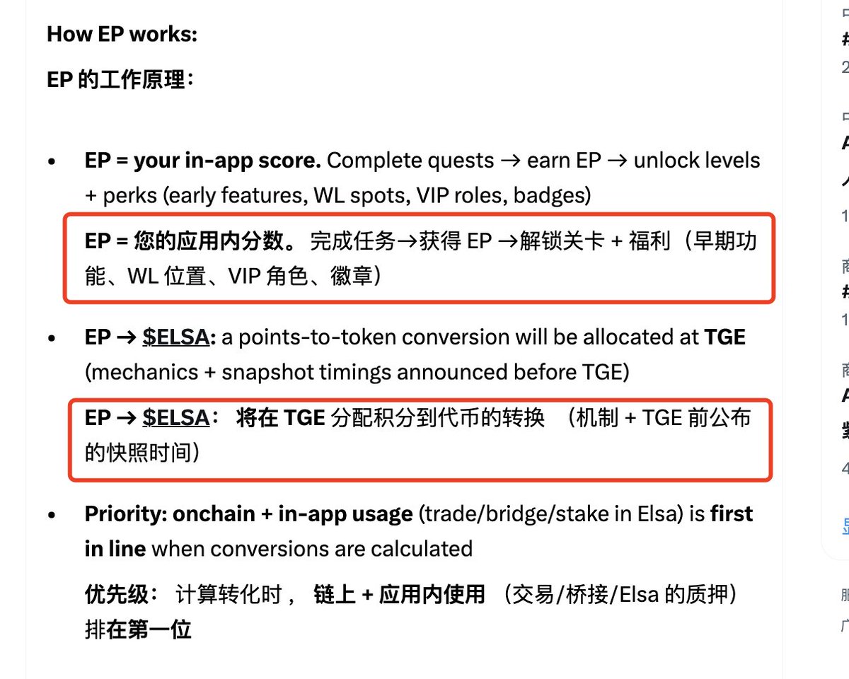 Base 生态基金投的 @HeyElsaAI 明牌积分 EP = $ELSA 100% TGE .EP决定未来的空投数量。