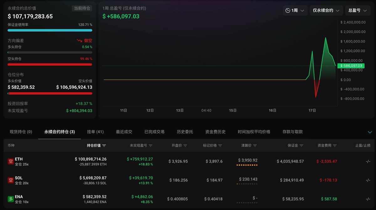 此外,他还一并开启了 $SOL 空单和 $ENA 多单,整体仓位浮盈 80.4 万美元