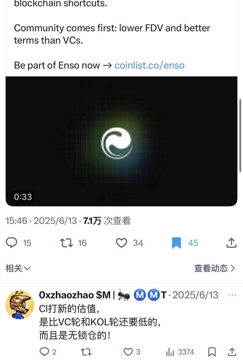 Enso要上线Binance了👀 6月13日, 阿zhao冲了1900U去Coinlist参与了Enso的社区轮打新, 当时给出的参与理由是 ·社区轮比VC轮的估值要低 ·社区轮比Kol轮的估值要低 ·TGE全解锁 虽然没有Monad的卡, 拿不到Monad的空投。 但是今天的Enso, 应该也能小麻一下👀