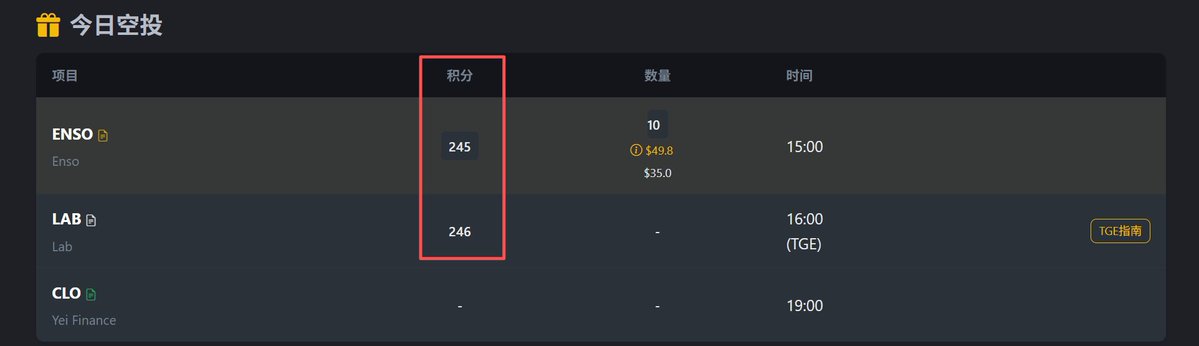 今天 $ENSO 和 $LAB 的分数直接冲到245以上的主要原因是 上个月25号和26号的两波大消分之后,前两天刚好回分。然后因为有 $MON 的预期在,所以大家都攒分等14号看看会不会上ALPHA 结果一攒都攒,现在高分地址肯定异常的多。 现在有几个选择 245以上分数的,这两天都都吃吧。因为单号的利润肯定被计算过。所以单纯攒分等大肉没啥意义 220以上的分数,建议再攒一周。20号左右的分数线可能会更友好一点 200以上的分数,我的建议是,这两天不动,等3-4天以后,吃1-2个先到先得。先把这波回分给错掉 200以下的,这个就攒分就行。最近观望
