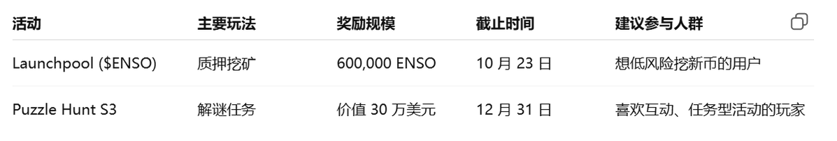 Mantle 双活动攻略:Launchpool × Puzzle Hunt 双线并行,怎么玩最划算? 最近 @Mantle_Official 社区又热闹了。 👉 Launchpool 新币挖矿 + Puzzle Hunt 第三季寻谜挑战 一个负责收益,一个负责乐趣。今天这篇长文,就带兄弟们搞清楚——这次的活动怎么参与最划算,怎么把收益最大化。 一、Launchpool 篇:$ENSO 新币池正式开启 这期 Launchpool 的主角是 $ENSO,来自 @EnsoBuild 团队。 Enso 是一个新一代链上执行层(execution layer),主打“让多链操作更高效”,属于基础设施方向的优质 DeFi 项目。 目前 Launchpool 共开放了 三种质押池,总奖励池为 250,000 ENSO,年化收益(APR)最高达 800%。 活动周期为:10 月 14 日 09:00 – 10 月 23 日 09:00(UTC),还有不到 9 天。 从数据上看,MNT 池参与人数最多,而 ENSO 池的 APR 最高。 如果你追求收益率,可以考虑少量分配进 ENSO 池; 如果更注重稳定与生态积分,则 MNT 池相对稳妥。 参与方式(超简单) 前往 Launchpool 页面 👉 https://t.co/Sq1LVDBqpm 连接账户后,选择想质押的资产(ENSO / MNT / BBSOL) 点击「Stake Now」即可开始产出 奖励可随时领取,活动结束后记得解仓 Tips: Mantle 用户(持有 $MNT 的)可以通过“Borrow & Stake”机制提升收益; 新用户或 VIP 账户还会额外获得 +50%~100% 的 Staking Cap 奖励上限。 二、Puzzle Hunt 篇:拼图寻宝,边玩边赚 除了挖矿,Mantle 还同步开启了 Puzzle Hunt 第三季。 这是一个结合任务系统与解谜机制的活动,参与方式轻松但回报可观。 活动时间 即日起至 12 月 31 日 18:00(UTC) 奖励池 总价值 30 万美元 的热门代币奖励(包含 MNT、ENSO 等) 参与方式 登录 @Bybit_Official 平台 完成充值、交易或兑换 $MNT 等任务 每完成一个任务,就能获得一块拼图碎片 集齐完整拼图可解锁相应奖励 👉 参与入口:https://t.co/r4ovyrOI8O 玩法小技巧 先看任务表:不同碎片对应不同操作,优先完成容易的。 多日累积:有的任务每天能重复完成,越早参与越划算。 分享加成:在社区展示进度截图,有时能拿隐藏奖励。 搭配 Launchpool 使用:Puzzle 的部分任务与 MNT 质押行为可叠加统计。 三、组合策略:双活动叠加收益 如果你想更高效地参与,可以用以下思路: 1⃣先在 Launchpool 中质押 $MNT 获取 $ENSO 奖励; 2⃣ 同时在 Puzzle Hunt 中完成 $MNT 充值 / 交易任务; 3⃣ 用获得的代币继续参与生态活动,实现「挖矿 + 解谜」双收益。 这种玩法既能稳拿挖矿收益,又能积累积分和额外奖励。 四、Mantle 的这两项活动,其实是生态建设的两种方向: Launchpool:让用户通过质押资产支持生态新项目; Puzzle Hunt:让社区通过互动任务了解产品与代币机制。 相比单纯空投,这种「轻参与 + 多奖励」模式更可持续。 你既能赚收益,又能体验产品、积累积分,为未来活动提前铺路。 总体来看,这波 Mantle 的节奏算是“收益 + 趣味”双线齐发。 老玩家可以边挖矿边解谜,新人也能快速融入生态。 同时也建议兄弟们理性参与,控制仓位,结合自身的情况来选择自己喜欢的活动参与!祝愿大家都能收获满满~