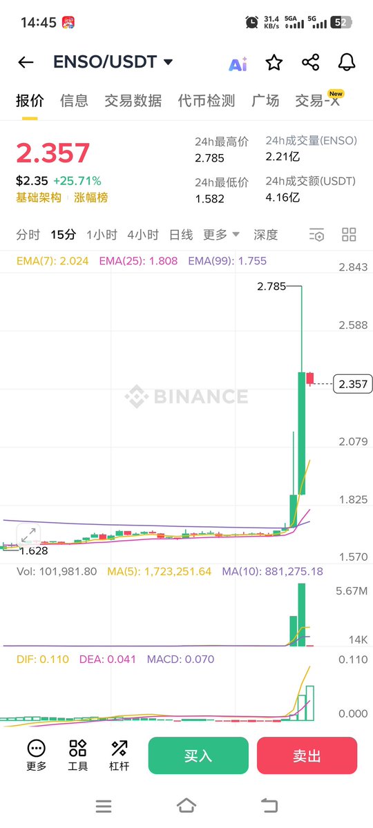 感谢 $Enso 投喂的猪脚饭 14.16分看到消息 Bithumb的上新公告,立马打开交易所,当时Enso的价格在1.8刀附近,直接追了一个多单进去,当时涨幅不大,插针上去又下来了! 没想到14.30分,Upbit又来了一个上线公告,直接拉到了2.7附近,直接系统挂单多单止盈了,虽然不是最高点平多,不过这个猪脚饭有点大! 舒服了!