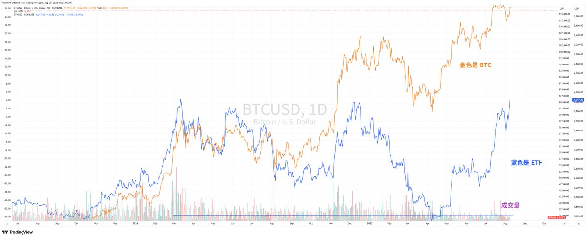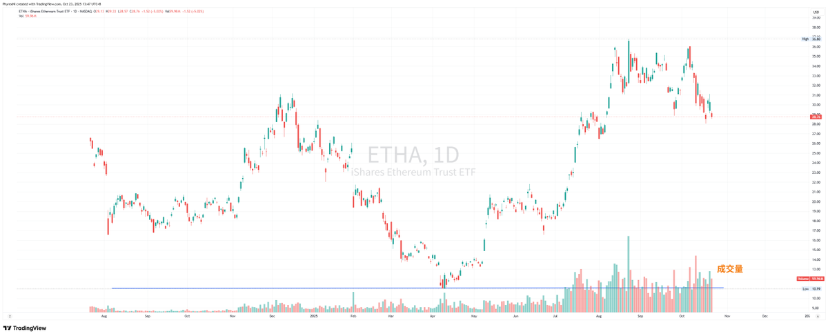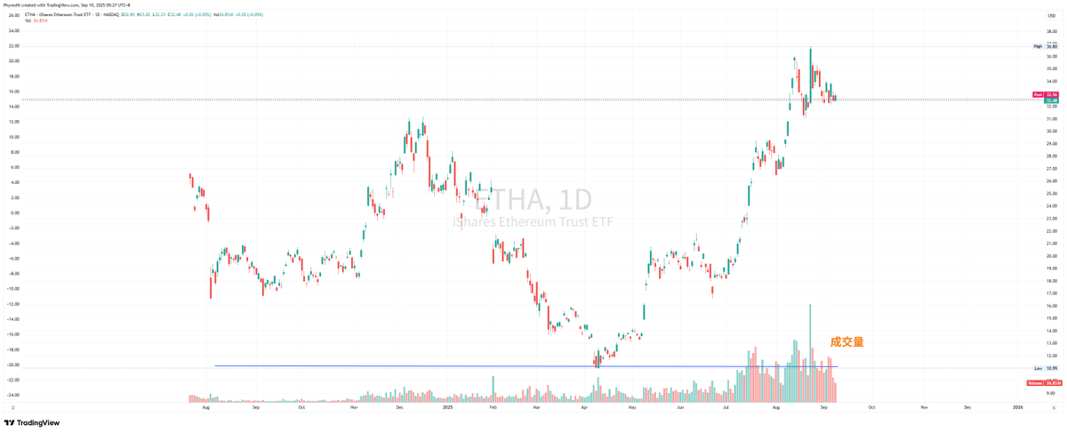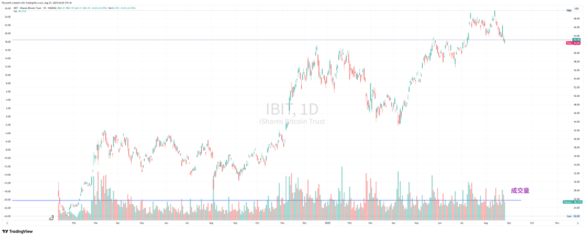 但是和 $ETH 完全不同的是,贝莱德的 $BTC 现货 ETF $IBIT 虽然最近一段时间二级市场的成交量也不错,但是从走势来看,还没有达到2024年3月的成交高点,甚至和2024年底以及2025年初的成交量相比都有所不足。
