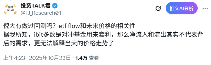 聊现货 ETF 挺有意思的,先回答逃课君 @TJ_Research01 的问题,实际上我做过大量的回测数据作为调查,实际上我发现大多数的情况下不论是 $BTC 还是 $ETH 的现货 ETF 数据与现货 Bitcoin 和 Ethereum 的价格走势没有太大的关联。