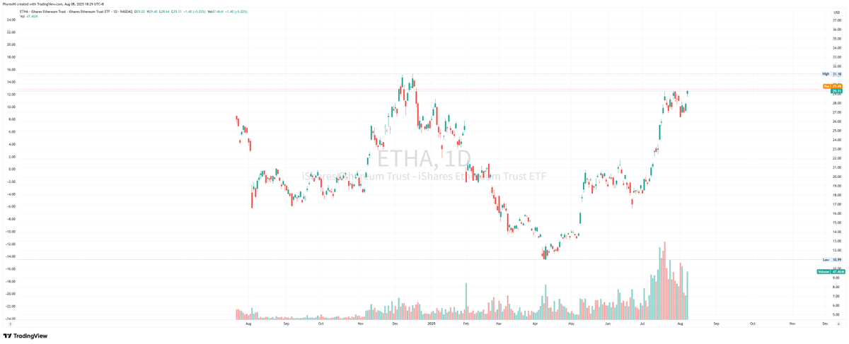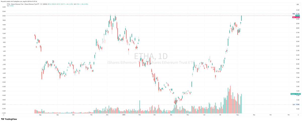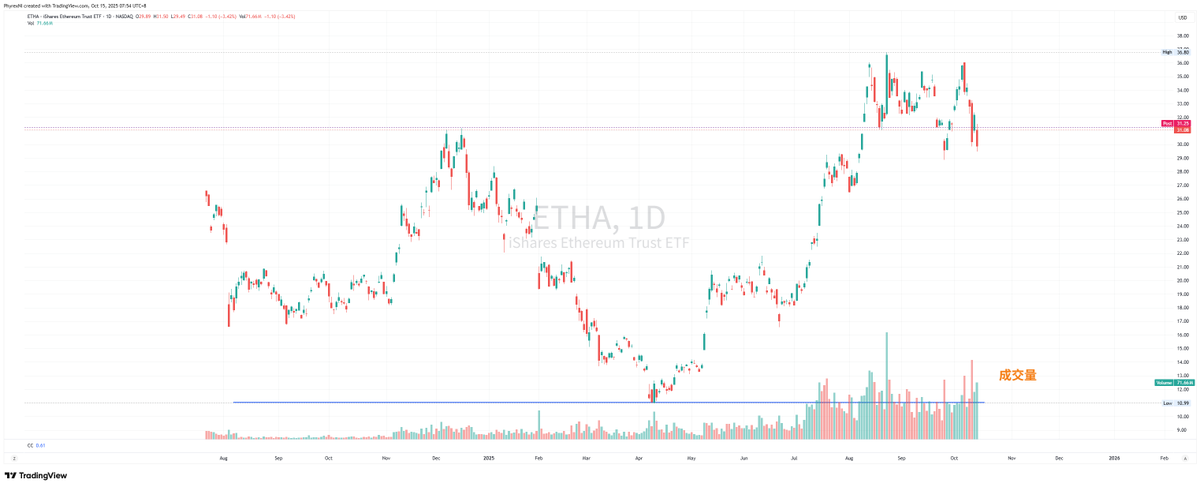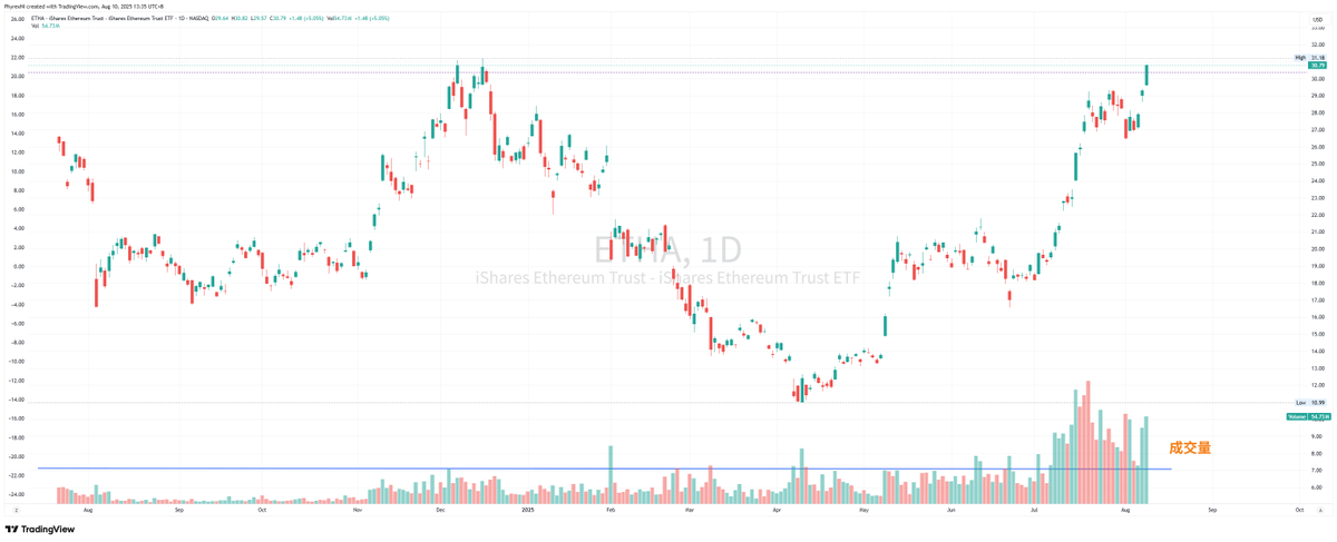 不仅仅是交易所的 ETH 成交量提升,现货 ETF 的 $ETHA 成交量也出现了上升,这种情况和 BTC 有很大的不同,感觉现在的资金开始在向 ETH 靠拢了,尤其是传统的 ETF 资金在推动一二级市场的成交量放大。