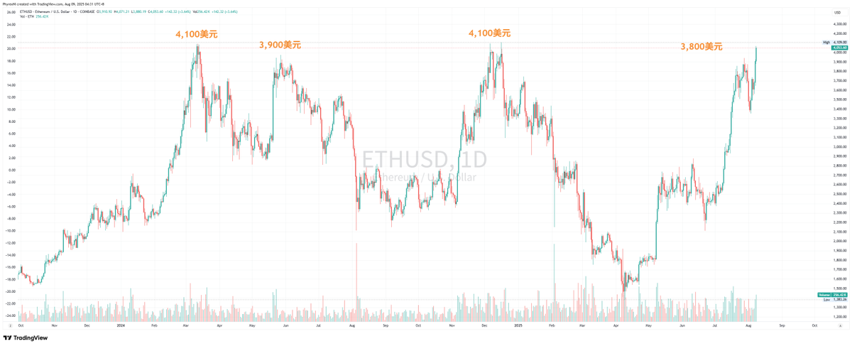 而同样的历史在2024年年底川普胜选的时候也出现过一次,这也是2024年第二次 ETH 冲上 4,100 美元,而且现在很多山寨币在2024年和2025年的历史高点,不是在2024年3月就是在2024年底和2025年初的这段时间,而且这次维持的时间更短。