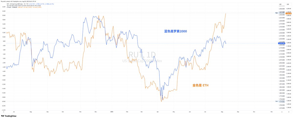 那么这和山寨季有啥关系呢?我之前多次和小伙伴们聊过 $ETH 的价格走势和罗素2000 有很强的重合性,罗素2000代表的就是美股中的小盘股,而 ETH 往往都认为是山寨币的头子,连我自己在以前都说过,山寨季的到来离不开 ETH 的上涨,毕竟只有 ETH 上涨了带动了更多的溢出资金才有可能带来山寨季。