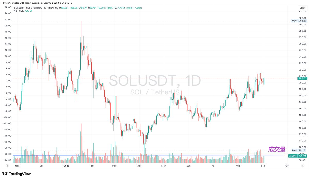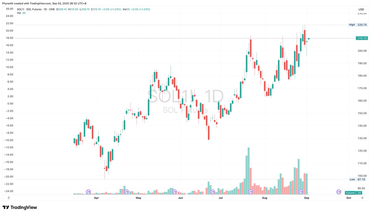 另外需要注意的是,同样也是最近一周的数据,能明显看到 $SOL 从 CME 的期货到交易所的现货成交量都有上升的趋势。