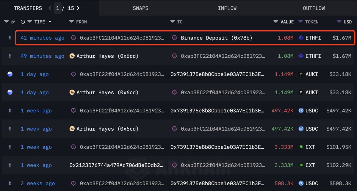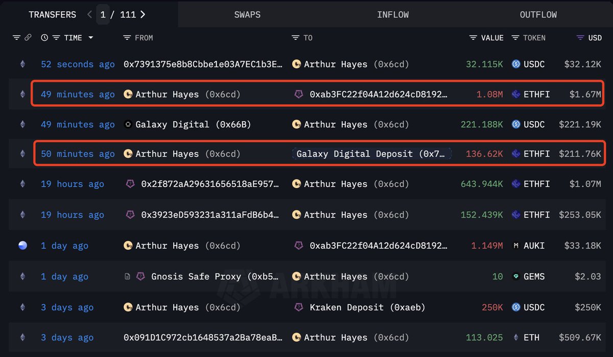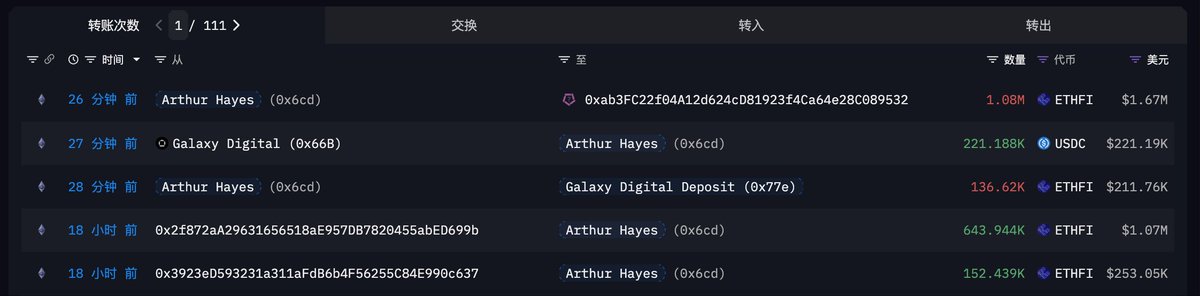 Arthur Hayes 在 7 小时前收到 https://t.co/WkyzgmMNNS 投资人分配地址转移的 79.6 万枚 $ETHFI ,价值 132.2 万美元🤓