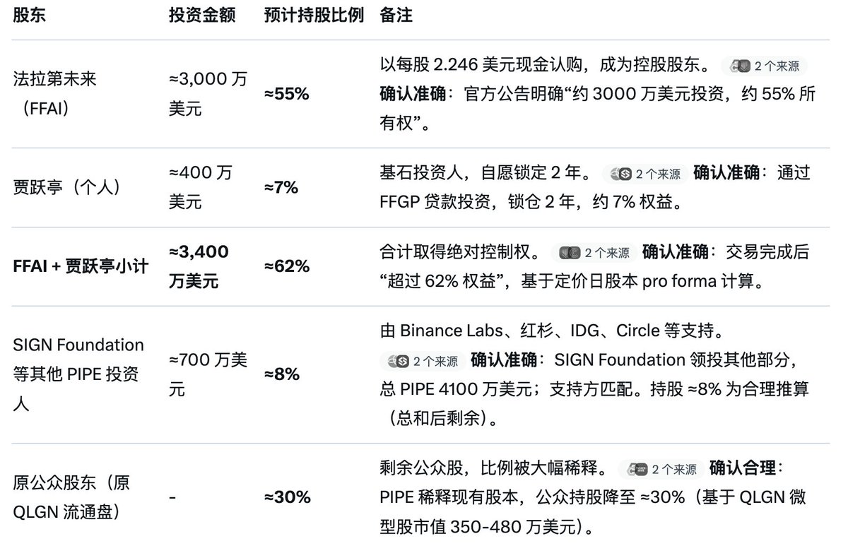 法拉第未来掏 3000 万,拿下控股权;贾跃亭个人投了 400 万,锁仓两年;合计持股超 62%。这波背后还拉来了 SIGN Foundation,背书方包括 Binance Labs、红杉、IDG、Circle。资本拼图一亮相,故事立马就不一样了。