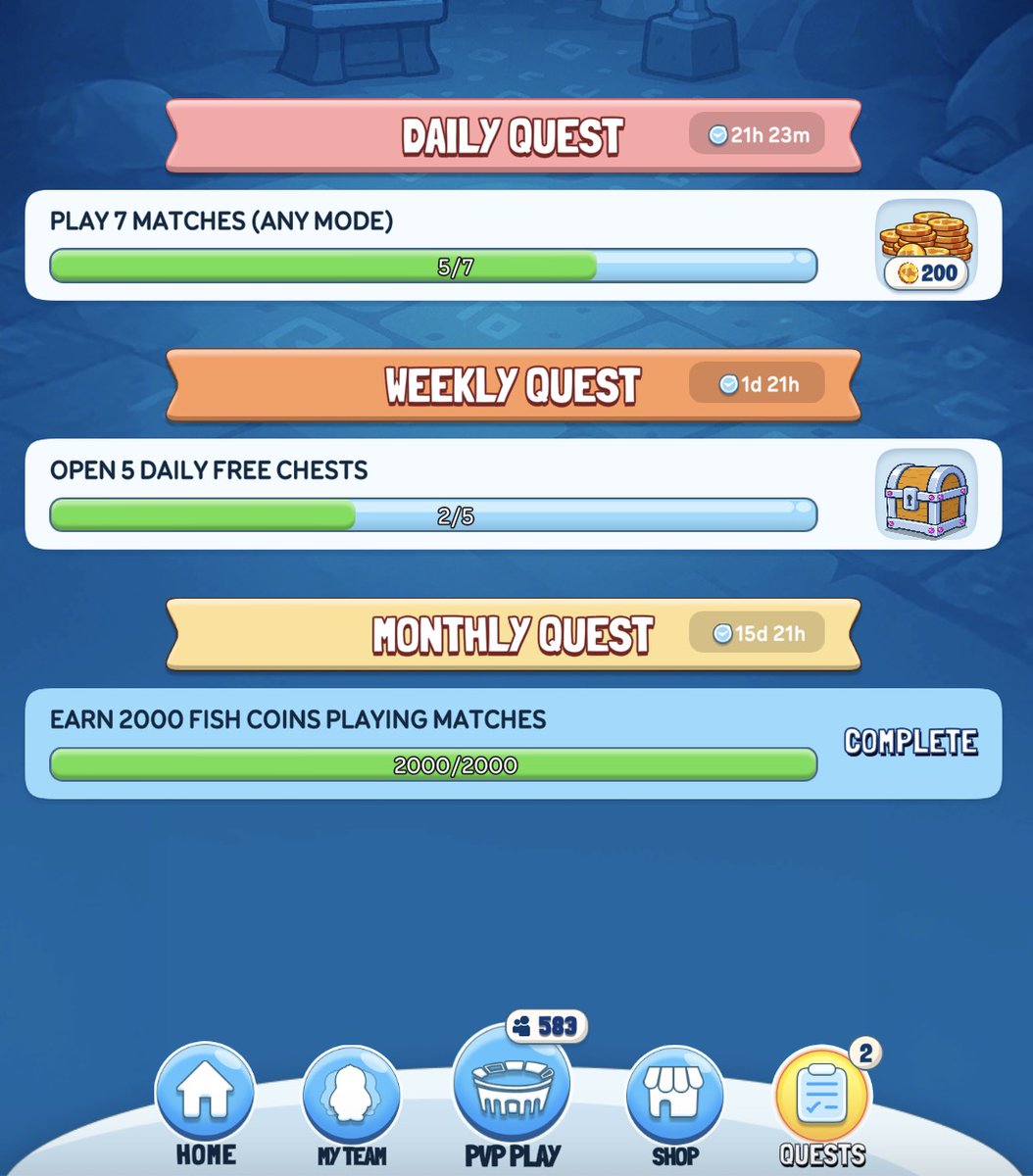 对战过程中,随着你胜利场次和金币的累积,可以解锁每日、每周、每月奖励,其中月度奖励是2000枚 $FISH 。