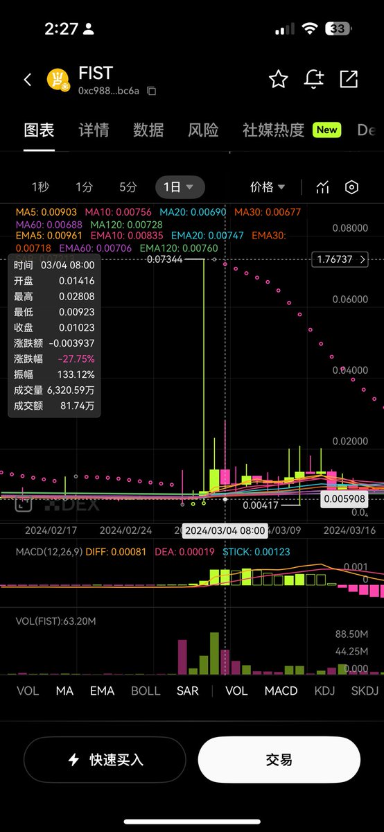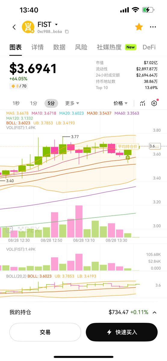$fist 0.64上车了几千刀😭,今天拉了点点,据说杭州搞千人活动,声势浩大,据说现在使用Bitget Wallet交易还可以瓜分1000刀奖池