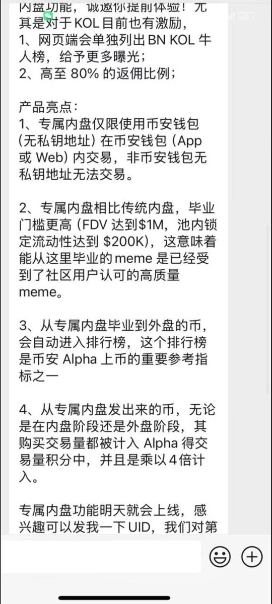 今天引起恐慌的那张图基本上算是提前泄露了“大的”是什么,本来想等官宣以后再好好说说,不过现在漫山遍野都在说,而且大家都很感兴趣,那咱们就假定这是真的,我先就着这个泄露版讲讲我的看法: 先说结论: 1/对 @BinanceWallet 是大利好,因为直接精准吸血当前用 OKx 钱包和其他钱包打 BSC meme 的用户。 你只能用币安无私钥钱包打内盘,且到了外盘你可以第一时间购买毕业的币,而且交易量有额外附加价值(Alpha 积分) 2/下一波 BSC 的 meme 热度将不再是漫山遍野的野盘子,而是币安钱包内盘发出的专属内盘币,无它,内定进入Alpha 爬天梯位置。 你不需要再去猜测 Alpha Listing 团队的芳心,他们就在排行榜头部(这也是我昨晚和早上清理各路小 meme 的原因)。 3/可以很大程度上改善当前 @pumpdotfun 模式和其他仿盘的痛点 -- bot 抢筹过多。 无私钥钱包是需要 KYC 的,而且有币安团队严格反女巫,在当前打狗游戏里科学家大哥们所想披靡的 Bot 将被很大程度的限制,从而避免每个 meme 发出来都先被刮一层浮油。 4/利好 @four_meme_ 。 早上很多人猜测是不是 fourmeme 要被币安自己革命了,不会,爸爸为啥要把儿子饭碗给抢了饿死他,four 敢发币这事儿技术经验成熟,直接结合不就好了么? 这个截图里没体现,但从现在 $Form 的价格看大概率是我猜测的剧本。 那为什么利好呢? 现在爸爸跟儿子直接传一条裤子了,你外来户还能竞争吗?断了这条心思吧。😂 最后,磨刀不误砍柴功,相信我你之前哪怕再不喜欢使用币安钱包,尤其是网页钱包,后面你都会要用的,组合拳还会继续。 今天就动动手绑定我币安钱包邀请码,给自己节省 10% 交易手续费,未来我也会把绑定我的小伙伴聚集起来作为新一代大狮兄社区班底,here we go! 邀请码:X7HMTOPH