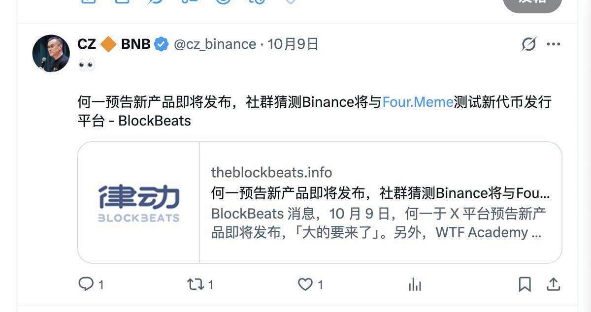 新一波造富已经开始了,很多人还没回过味,$bnbholder 速通 100M 现在做什么: 1/赶紧去更新你的币安钱包,不然看不见 2/fourmeme 已经更新了独家 meme 发行页面 3/看到好的就冲一下,不错过 收回来的拳头✊又开始打出去了,利好 $BNB
