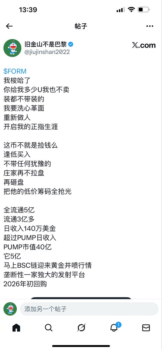 $FORM 我梭哈了 你给我多少U我也不卖 装都不带装的 我要洗心革面 重新做人 开启我的正指生涯 这币不就是捡钱么 逢低买入 不带任何犹豫的 庄家再不拉盘 再砸盘 把他的低价筹码全抢光 全流通5亿 流通3亿多 日收入140万美金 超过PUMP日收入 PUMP市值40亿 它5亿 马上BSC链迎来黄金井喷行情 垄断性一家独大的发射平台 2026年初回购