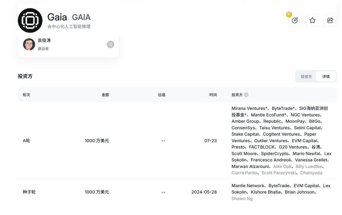 Gaia 项目在发展的初期,已经获得了 2000 万美元 的融资,分别来自种子轮和 A 轮的投资。其投资方包括 ByteTrade、Mirana 等知名机构。这些资金的注入,不仅为 Gaia 的技术研发和市场扩展提供了有力支持,也为其进一步的生态建设打下了坚实的基础。