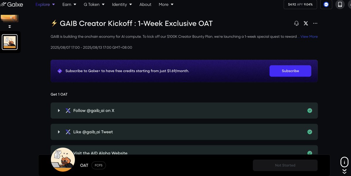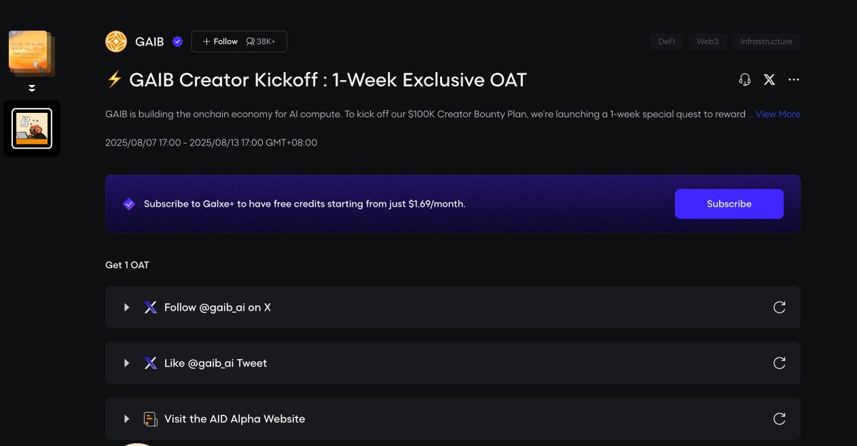 除此之外可以去 @Galxe Galxe Starboard 积极分享GAIB,官方 @gaib_ai 准备了10万美金给前200名用户,排名由算法根据 X 活动确定,由 @Galxe 自动跟踪无需提交