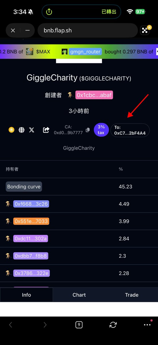 flap平台最早发出来的为 @GiggleAcademy 慈善捐款机制代币 $GIGGLECHARITY 0xd02a1e40387192a551f611b3107657ca9e9b7777