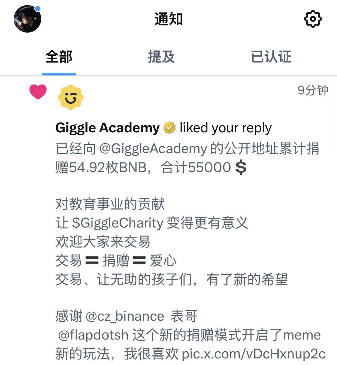 捐赠额度超越了很多,但大家的目标都是在为慈善事业做自己的贡献,爱心不分大小,可以是一美元也可以是一千万美元!这个模式也获得了 @cz_binance 的承认重新觉得meme很有意思