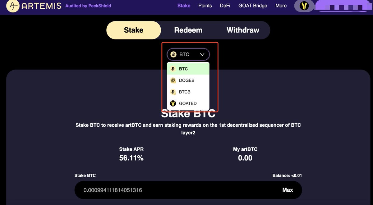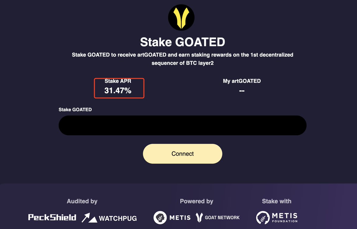 3)Staking。Stake BTC/$GOATED 于 Artemis,借贷于 Sumer/Avalon。奖励BTC(原生 gas)+ $GOATED (APY 45%+)。