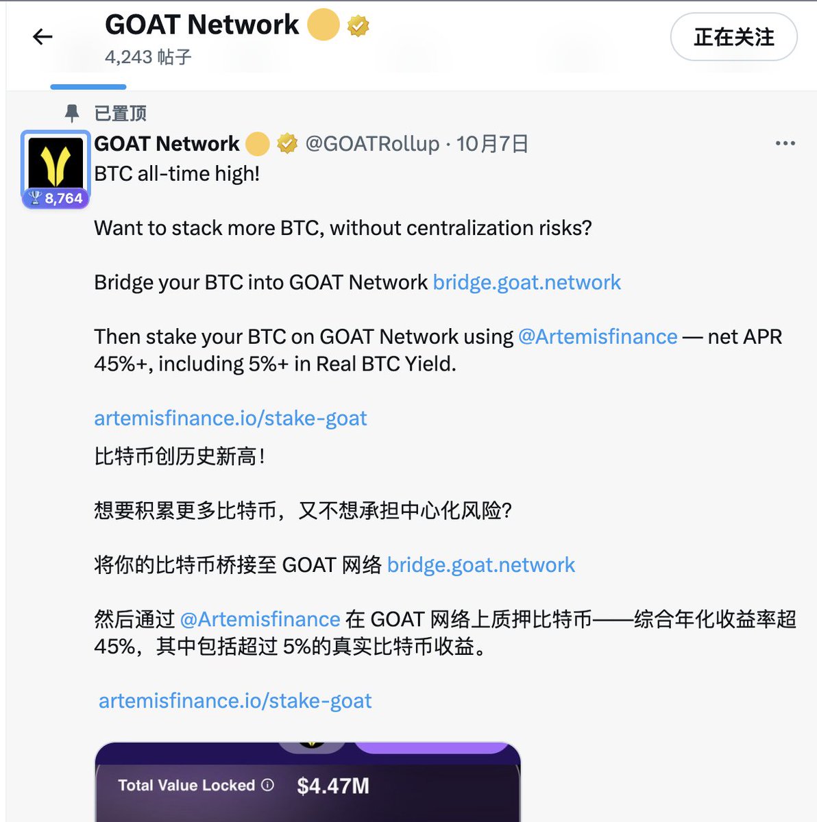 另外@Artemisfinance平台质押GOAT-BTC年化差不多能搞到50%,收益率还是挺给力的,感兴趣的可以操作一下,毕竟放钱包不如让它生崽。
