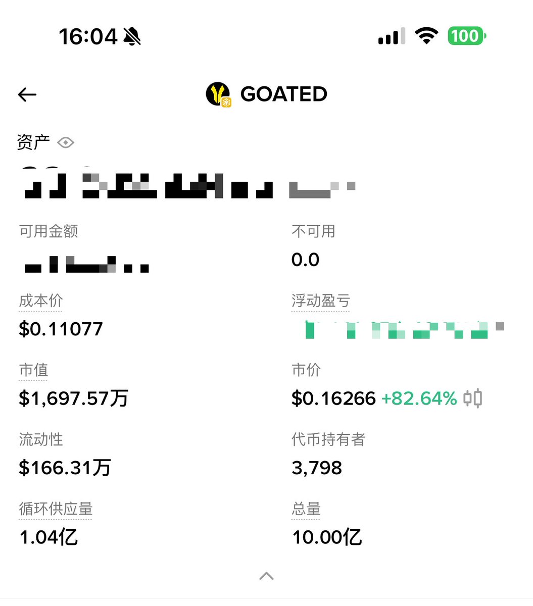 $GOATED 总供应为 10 亿枚,目前流通 1.04 亿(约 10.4%),团队与顾问部分锁仓完整,前 12 月完全锁定,后 18 个月线性释放,合计解锁期 2 年半