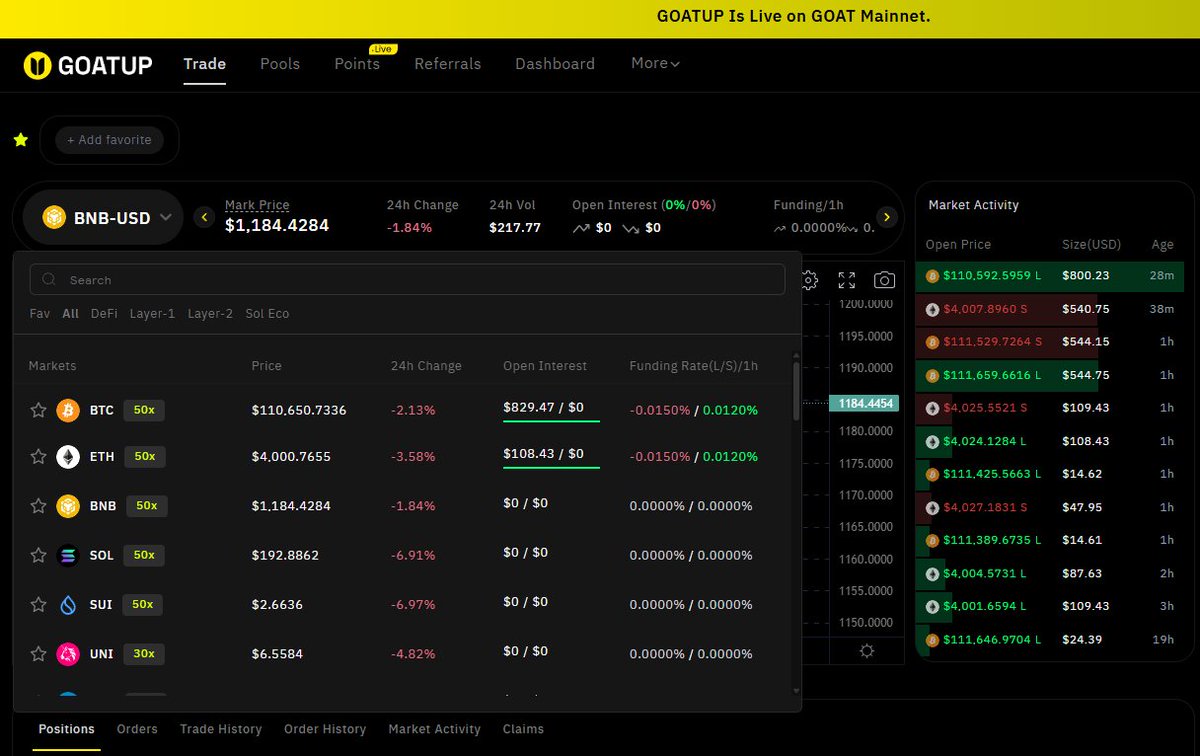 GOAT Network @GOATRollup 主網 GOATUP @goatup_ 永續合約正式上線 。