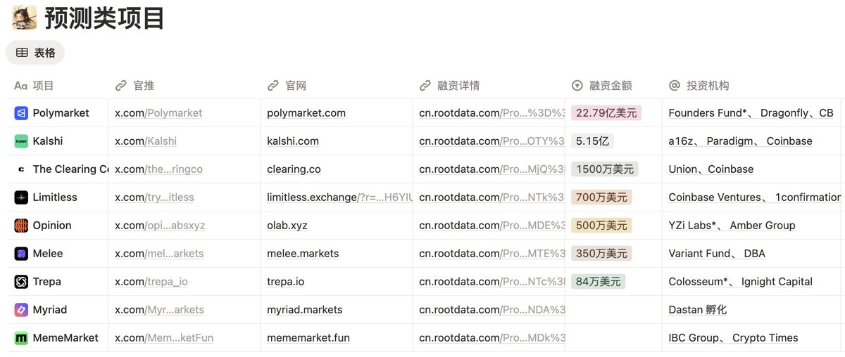 趁空闲,提前把另外一个热门赛道整理了下。龙头毫无疑问当属 Polymarket 融资金额达到恐怖的22亿+,另一个甚至没听说的黑马融资金额也悄悄的来到了5亿+级别。