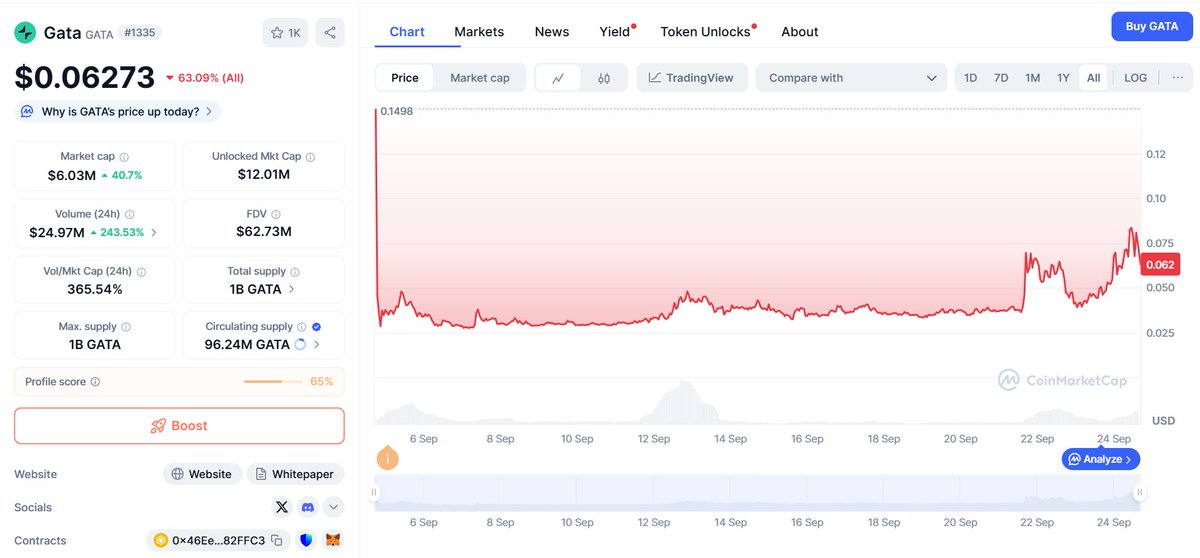 今天来和大家分享一个币安生态的项目 $GATA ,它是 9 月 4 号上线币安 alpha 的,自己了解的时候也简单的整理了些信息,感兴趣的可以一起来看看: ​ 背景上,@Gata_xyz它是属于币安第 7 批扶持项目(同批有 sidekick、vooi),今年 4 月获得过 400 万美元融资,投资方包括 YZI Labs、IDG Blockchain 在 Greenfield 生态里有真实用户,已上线币安 alpha、gate、bitget 等交易所,落地进展比较扎实。​ 用户数据方面,目前有 200 万+累计用户,日活大概 1.5 万+,在去中心化 AI 赛道里,这样的用户基础算比较实在的。​ 再看两个关键的维度:​ 价格与市值:当前价格大概 0.06,市值 600 多万,从 dexscreener(链接:https://t.co/S8g6QTeBNI)能看到,筹码集中、近期资金流入稳定,波动不算大。​ 算力布局:官方计划推出 dGPU 进入去中心化算力市场,现在 OpenAI 等头部 AI 公司对算力需求旺盛,去中心化领域刚好存在算力缺口 这个布局或许能补上这块短板,对普通用户而言,也可能降低参与 AI 算力的门槛。 ​ 想了解最新动态,建议关注官方推特 @Gata_xyz,信息会更直接准确,整体看,这个项目有生态背书、真实用户基础,还有明确的落地规划,感兴趣的话可以多留意一下。