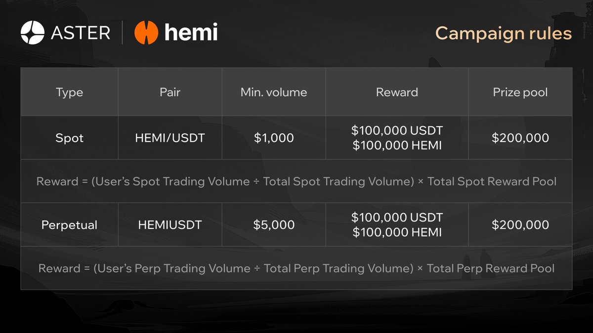 到 Aster 交易 $HEMI,现货单账号累计 ≥ $1,000 合格,合约 ≥ $5,000(5x) 合格;你占活动总成交量的比例,乘以对应奖励池,就是你的奖金;活动结束 T+7 天发放,USDT 与 HEMI 各占一半。公平透明,先到先赚