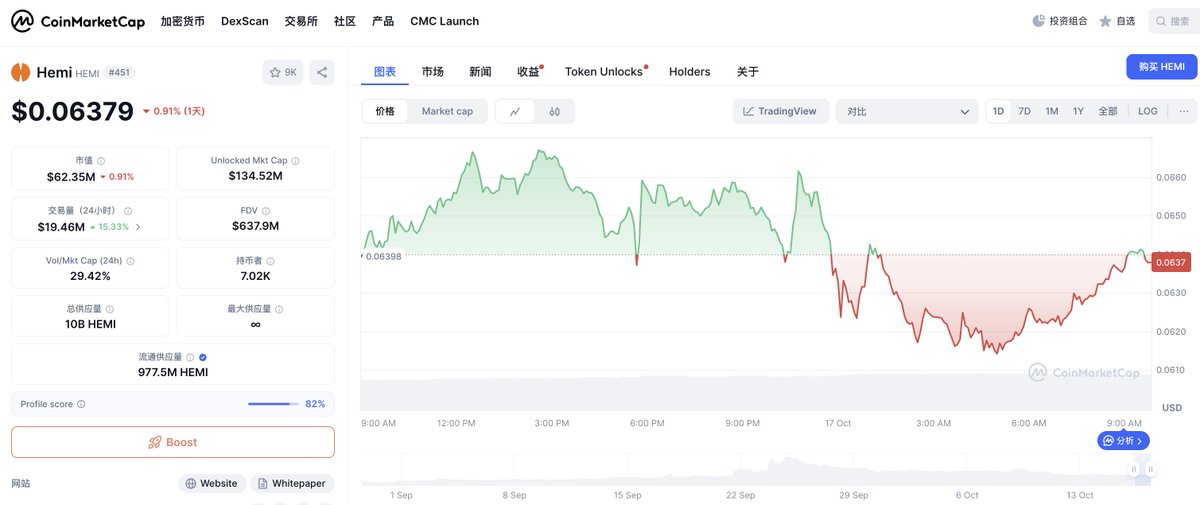 代币 $HEMI 价格约0.0642美元,市值6279万美元,24小时交易量1667万美元,TVL/市值比19:1,显示低估潜力。X 平台超10万验证用户,测试网65万+钱包参与,社区81%看涨,主网上线38天 TVL 达10亿美元,用户超13.6万。