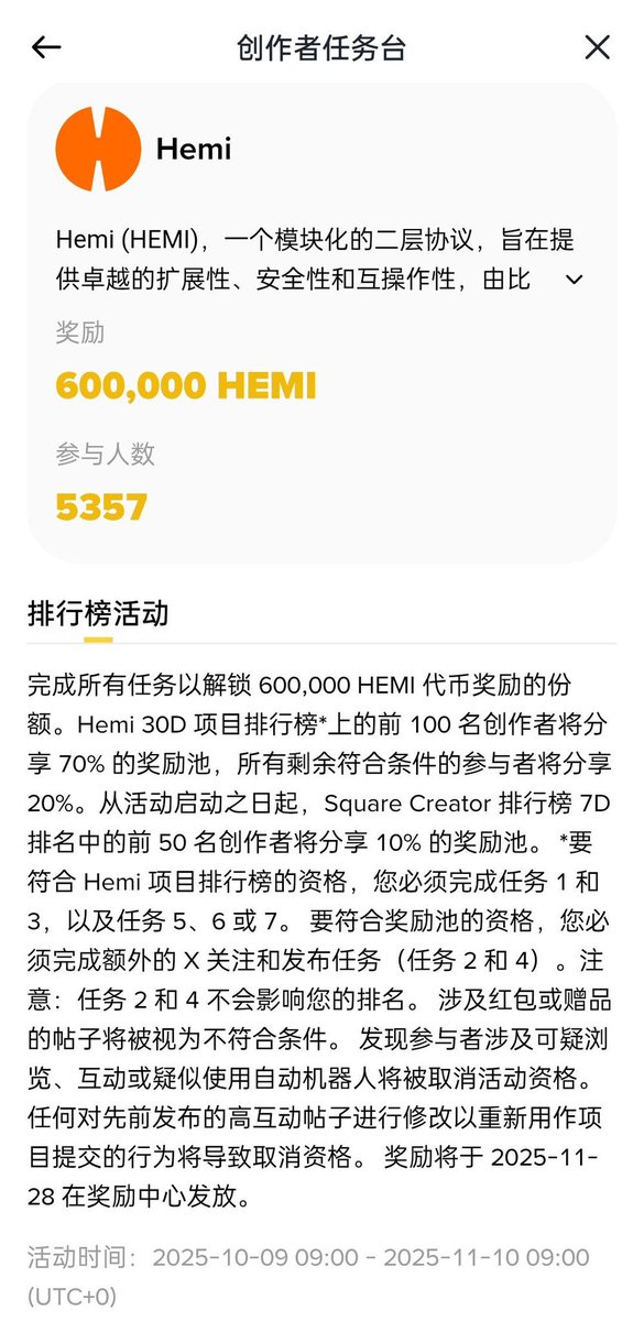 同时,这次活动的规则也简单。交易对是 HEMI/USDT 和 HEMI/USDC,门槛为现货 1,000 美元、合约 5,000 美元(5x 杠杆),奖励总额 40 万美元,现货与合约各占一半,发放比例为 USDT 与 HEMI 各 50%。所有结算都在链上完成,活动结束后 T+7 发奖。