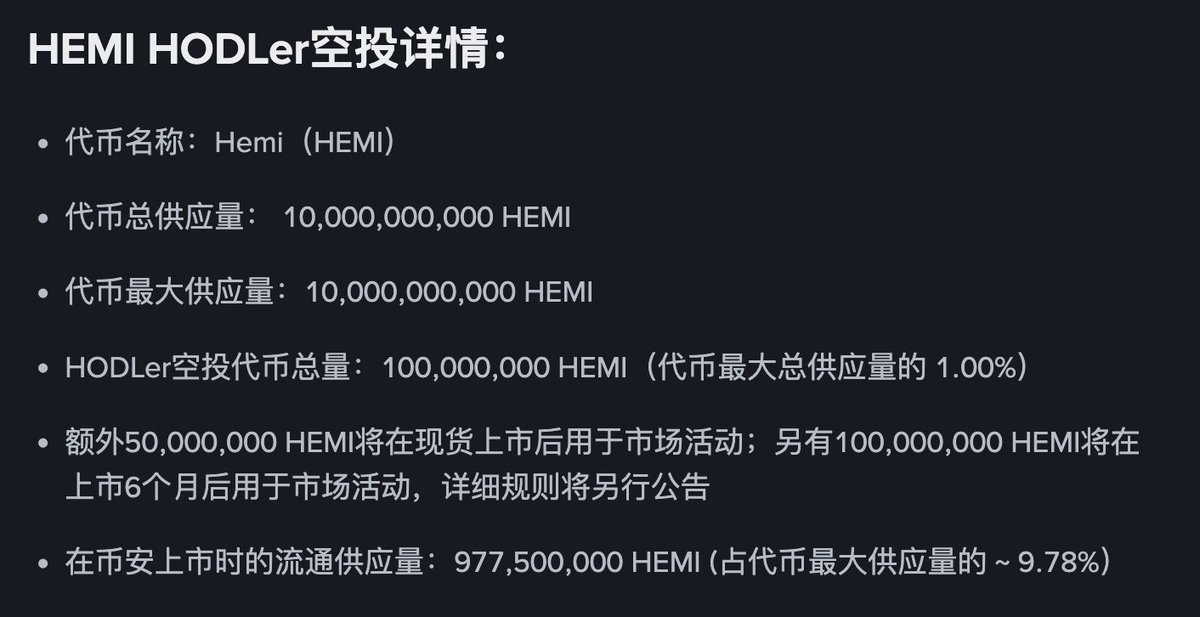 • 空投规模:共计 1 亿枚 HEMI(占总量 1%)