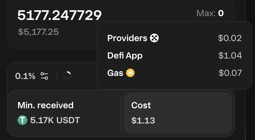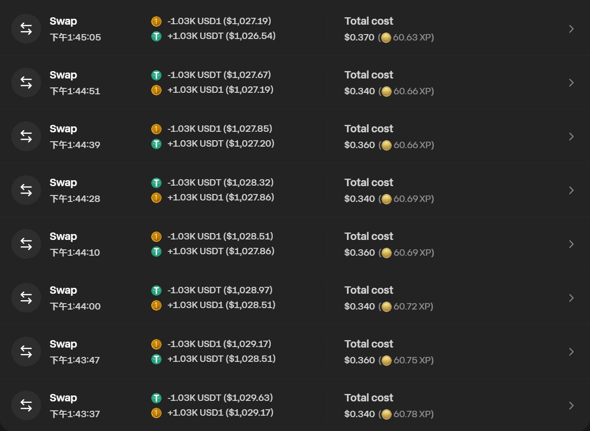 目前USDC/USDT的交易对,基本上单币swap在5000U左右。可以拿到300XP。正常来讲兑换之间的磨损大概是0.3u,手续费1.1U左右,其中给到OKX那边0.02U, @defidotapp 拿1.04U,剩下0.1U不到的Gas。