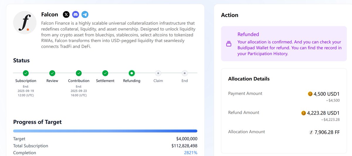 Falcon @FalconStable 的预售已经结束了,可以在buidlpad退款了,打了4500 ,给了7900颗,总共打了20个号,不知道结果会咋样