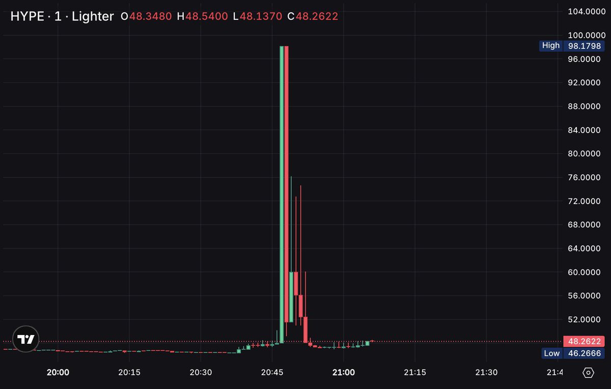 - 後續處理:Lighter團隊從前端圖表中「清理」(scrub)了這個低成交量的高價wick,以避免圖表縮放問題嚇壞用戶(on-chain 數據仍完整可查)。官方聲明確認「無清算或其他負面影響」,僅是「失控bot塞滿訂單簿」。
